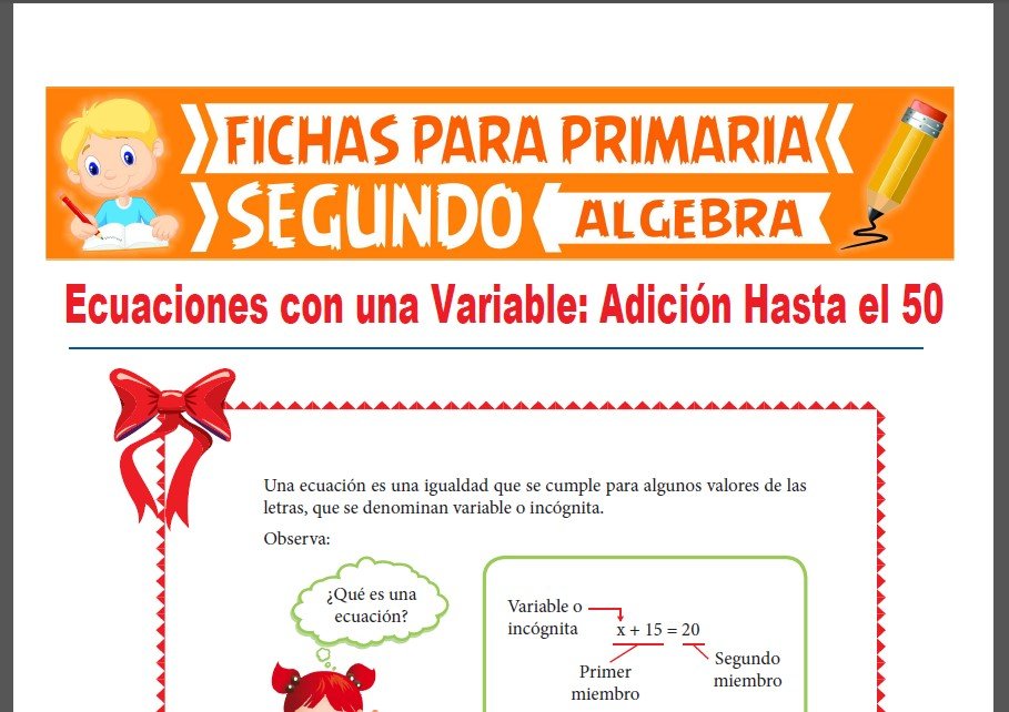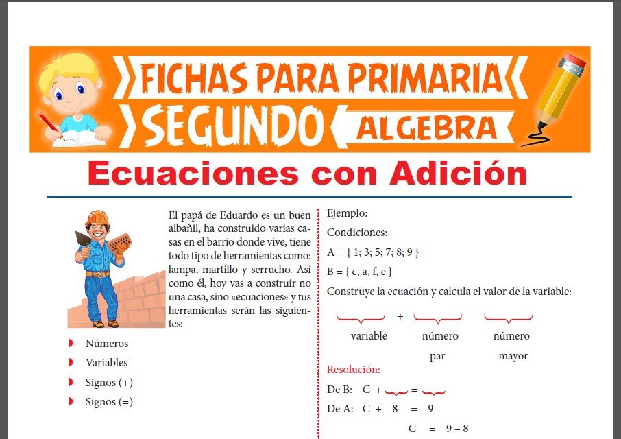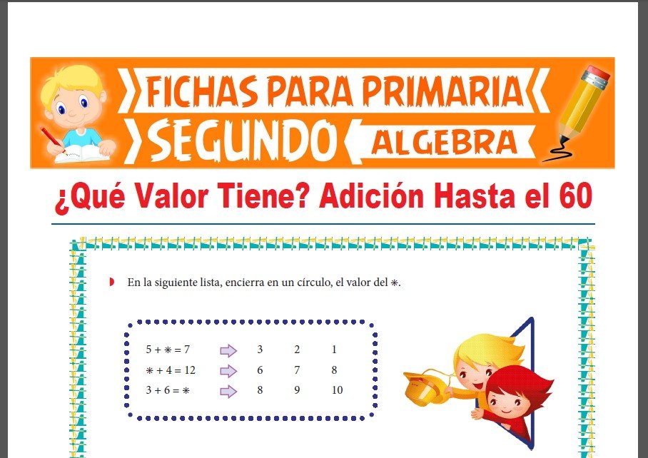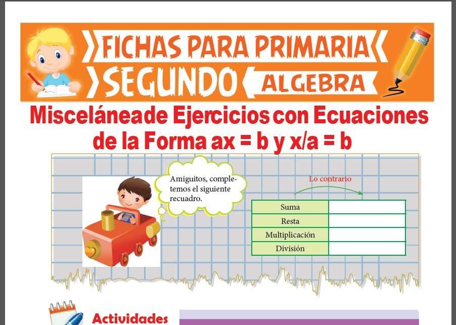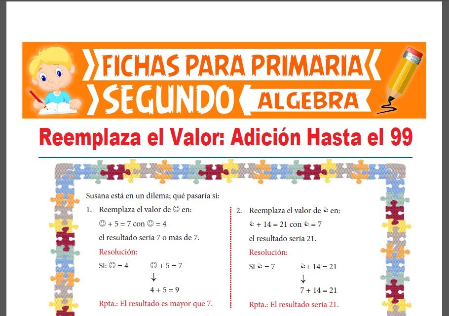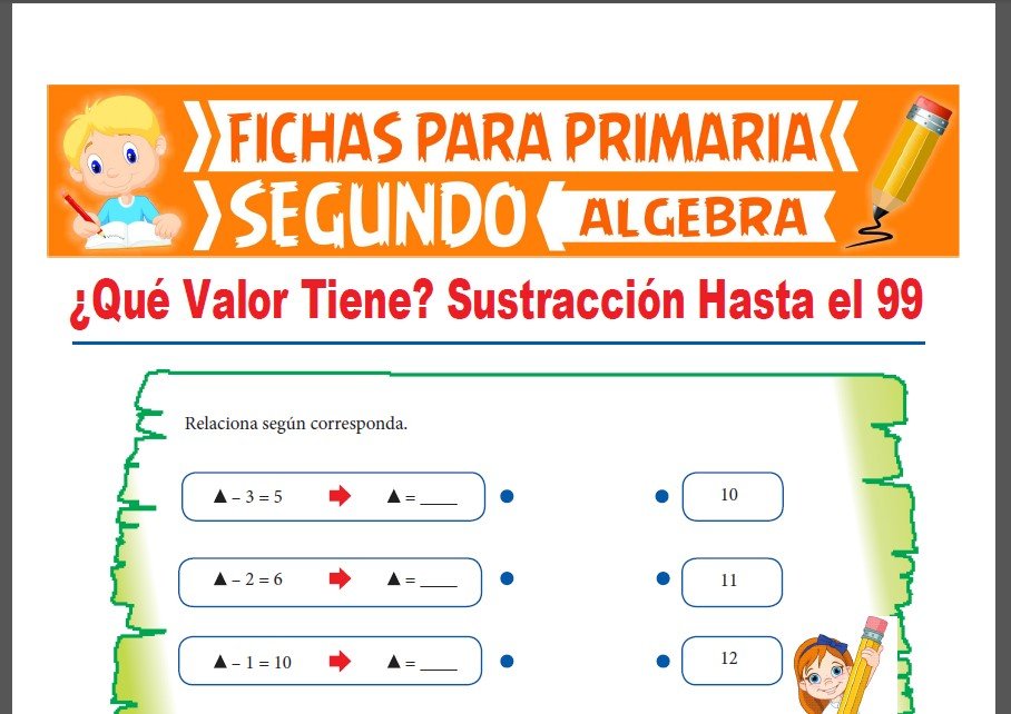 Aquí encontraras 28 fichas educativas que contienen bastantes Ejercicios y Actividades de ÁLGEBRA para Segundo Grado de Primaria o niños que tengan entre 7 y 8 años. Estos recursos educativos los podrás descargar de forma GRATUITA en formato PDF